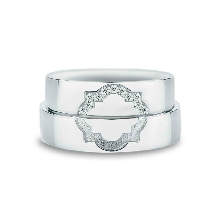 Fede nuziale in oro collezione Echo Palumbo e Gigante con scudo inciso nelle due metà, ornato di diamanti taglio brillante. Larghezza 50 mm. Si prega di notare che le dimensioni del prodotto possono variare in funzione della misura della creazione ordinata. Per maggiori informazioni sul gioiello e sulle richieste urgenti si prega di contattarci.