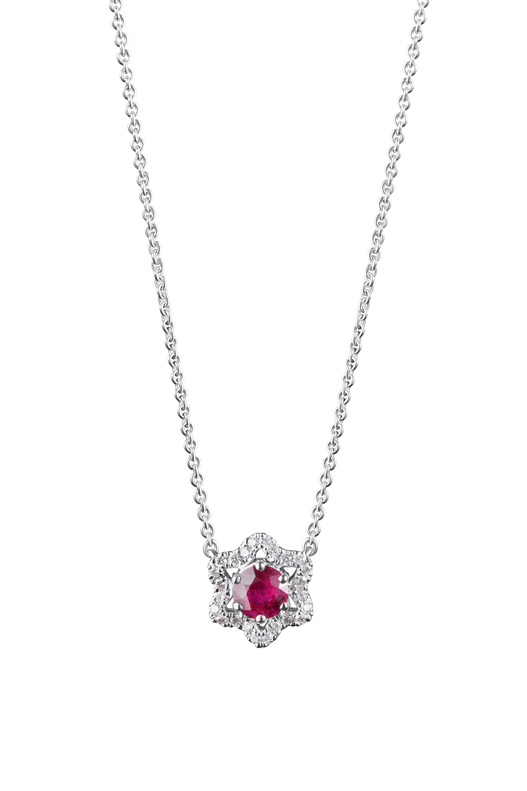 Girocollo in oro bianco 750/1000, rubino (0,50 ct) e diamanti (0,13 ct colore F purezza VS). Si prega di notare che il peso in carati, il numero di pietre e le dimensioni del prodotto possono variare in funzione della misura della creazione ordinata. Per maggiori informazioni sul gioiello e sulle richieste urgenti si prega di contattarci.
